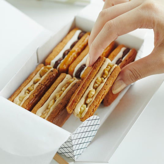 ブランド発足以来長らく愛されてきた、パティシエたちが自社工房にて丁寧に手作りするバターサンドイッチ。箱の中には、定番のレーズンサンドと、季節で変わる果実やナッツのサンドが3つずつ。スパイスを効かせたサブレに果実味溢れる香り高いクリームを挟んだ、ジューシーで特別なサンド菓子です。風味、食感、余韻。サブレとクリームのベストフレンドな調和をお楽しみいただけます。