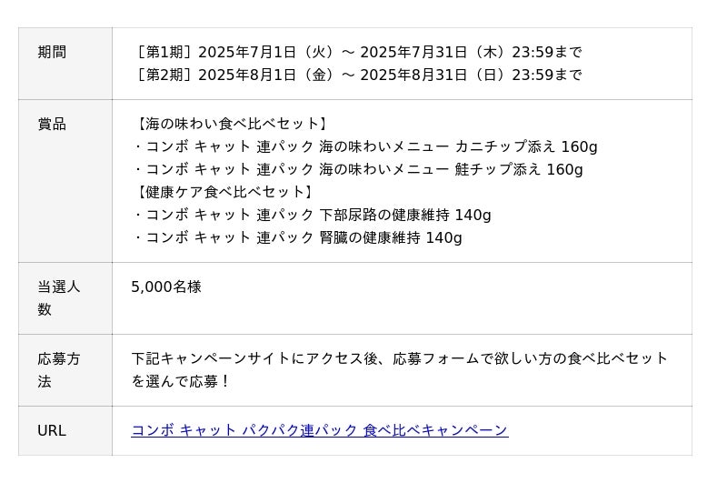 2025年7月1日~8月31日、日本ペットフード株式会社(本社:東京都品川区、代表:代表取締役社長執行役員 片山 俊次)は、「コンボ キャット パクパク連パック 食べ比べキャンペーン」を実施いたします。
