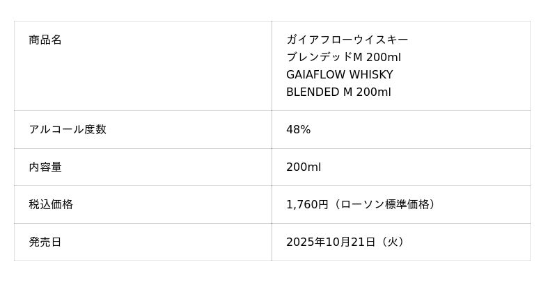 静岡県でウイスキーを製造販売するガイアフロー静岡蒸溜所(静岡県静岡市葵区落合555番地/代表 中村大航)は、定番ブレンデッドウイスキー「ガイアフロー ブレンデッドM 200ml」を2025年10月21日(火)より、全国のローソン、ナチュラルローソンにて販売を開始いたします。