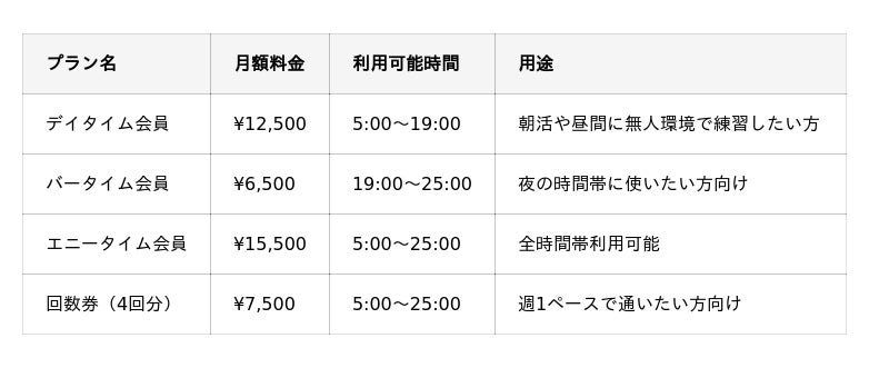 すべての月額プランは回数無制限。常時2枠(60分×2)まで予約可能で、混雑時もスムーズに利用できます。朝活にも、仕事終わりのリフレッシュにも、生活スタイルに応じて自由にご利用いただけます。