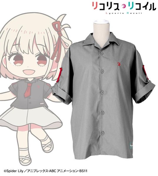 ちびキャラの井ノ上たきなが着用している、大きめのボタンが特徴のハーフスリーブシャツです。