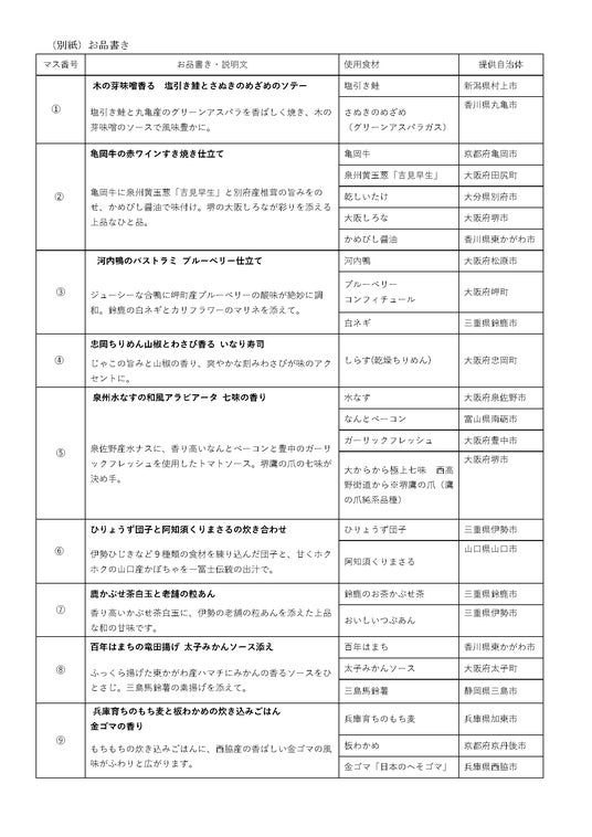 全国から寄せられた43の食材から、25の食材を厳選。その選考にあたっては、食材にまつわる開発ストーリーや作り手の想い、環境への配慮、また、次世代へつなぎたい食材であるかどうかという視点も重視。そうして選ばれた個性豊かな食材たちは、お互いの魅力を引き立て合い、新たなおいしさと感動を生み出しています。