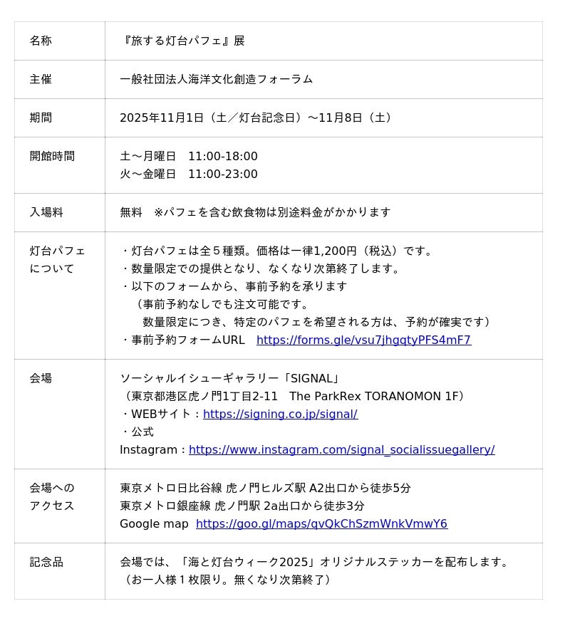 日本財団「海と灯台プロジェクト」を運営する一般社団法人海洋文化創造フォーラムは、「海と灯台ウィーク2025」キャンペーンの一環として、「灯台記念日」の11月1日から8日までの8日間、ソーシャルイシューギャラリー「SIGNAL」(東京都港区)にて、『旅する灯台パフェ』展を開催します。