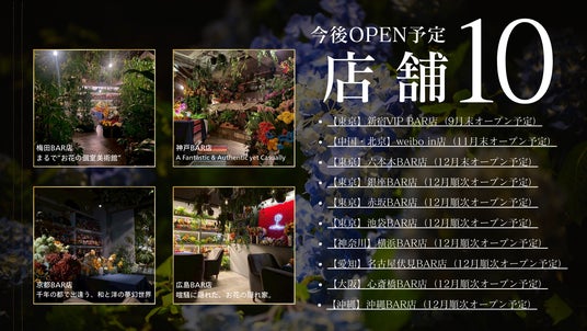 株式会社クローバークラブ(本社:東京都、代表取締役:松田真治)が運営する完全会員制のお花のBAR「EBISU FLOWER PARK」は、2025年12月までに全国19店舗への拡大と中国・北京への初進出を決定いたしました。