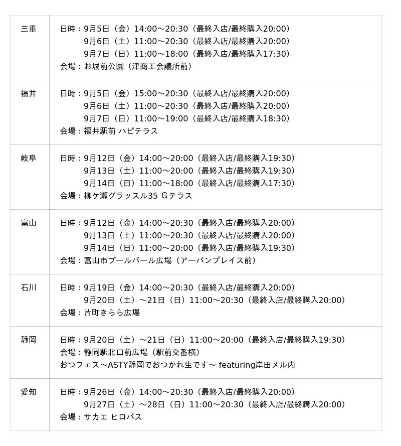 <出張マルエフ横丁 東海・北陸エリアスケジュール>