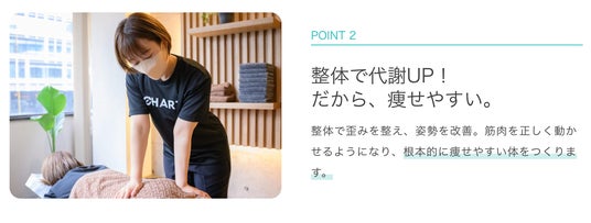 パーソナルジムCHARTは、幅広い年齢層の方にご利用いただいていますが、一番多いのは、40-50代のお客様です。「痩せたい」という共通のお悩みに加えて、慢性的な肩こりや腰痛、姿勢改善など身体の不調や身体の歪みを治したいという方が多いです。マンツーマンの広い空間ですので、他の方を気にすることなく、整体とトレーニングに集中することができます。