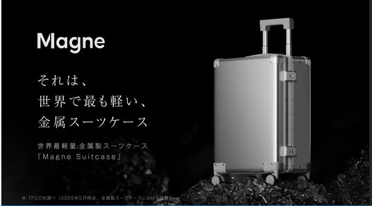 旅行ジャパン株式会社 (本社:東京都渋谷区、代表取締役CEO:猿渡歩) は、「強さと軽さ」をテーマにした旅行ブランド『Magne (マグネ) 』を発表。第1弾となる新製品として、世界で初めてボディ全面にマグネシウム合金を採用した金属製スーツケース「Magne Suitcase」を、2025年7月1日(⽕)~8月15日(金)の期間限定で、株式会社マクアケ (所在地:東京都渋谷区、代表取締役社長:中山 亮太郎) が展開する日本最大級の応援購入サービス「Makuake」において、先行販売致します。
