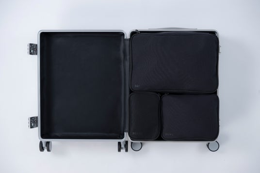 大・中・小の 3 サイズで、スーツケースの⽚開き構造にぴったり収まる専用ポーチ。収納効率を高め、旅の荷造りをスマートにします。
