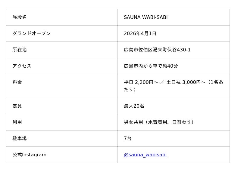 株式会社ditto(本社:広島県、代表取締役:齊藤将輝)は、広島市佐伯区湯来町にて蔵サウナ施設「SAUNA WABI-SABI」を2026年4月1日にグランドオープンしました。空き家となっていた築100年の古民家と土蔵をリノベーションした本施設は、湯来町の地下から汲み上げた超軟水の掛け流し水風呂と、特大薪ストーブを備えた蔵サウナを核に、この土地にしかないサウナ体験を提供します。