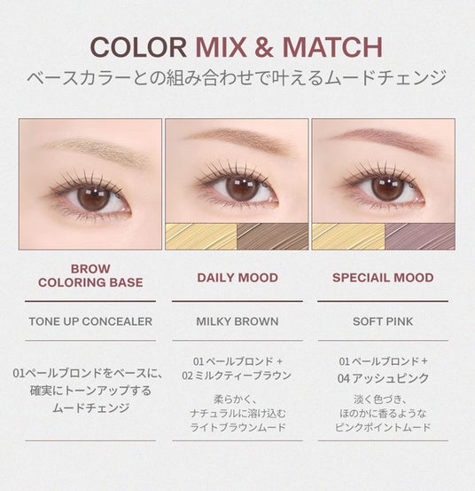 「ドットオンムード フェイクアップブロウカラー」は、地毛からブリーチ毛まで幅広く対応し、その日の気分や雰囲気に合わせて自在に眉メイクを楽しめるアイテムです。