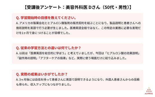美容外科医のDさんは広範囲な医療英語を学ぶのではなく、実際の業務で必要な部分だけに集中した結果、3ヶ月で新たな収入源を獲得することに成功しています。
