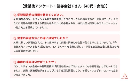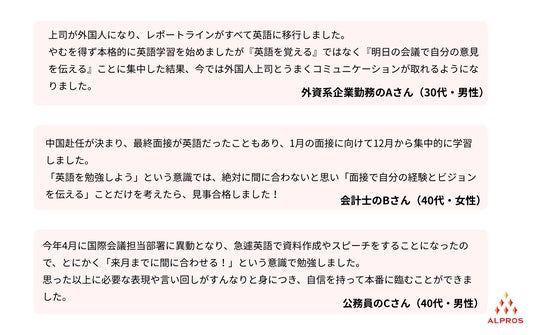 株式会社アルプロス(本社:東京都新宿区、代表取締役:山本 正和)では、英語を仕事で使うことに関する意識調査として、語学留学と同じ環境で英語4技能を学ぶ世界基準「1ヶ月集中プログラム」に通って頂いた社会人22名にインタビューを行ったところ「英語を勉強しても話せない人」と「短期間で英語を使えるようになる人」には根本的な学習目的の設定において意識の差があることが分かりました。