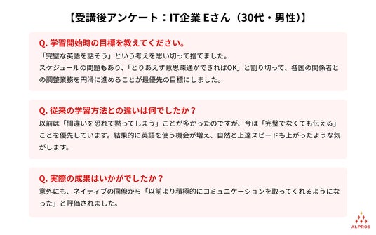 Eさんは「最低限のコミュニケーションが取れれば十分」と割り切ったことで、学習に対するプレッシャーが大幅に軽減されたこともあり、積極的に英語を使うようになったことでネイティブな英語を話す同僚からも評価されるほどに、英語力だけでなく、英語でコミュニケーションを取る力も成長されたようでした。