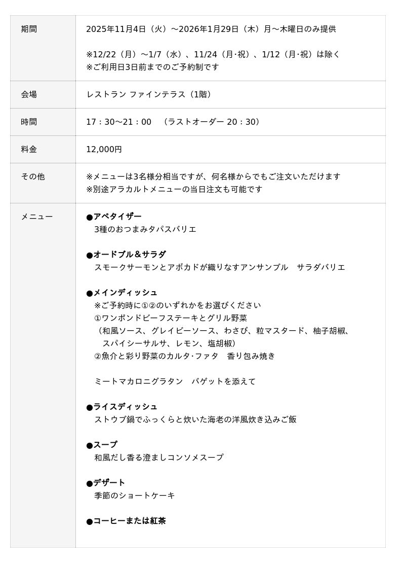 舞浜ビューホテル by HULIC(所在地:千葉県浦安市、総支配人:鈴木裕樹、運営:ヒューリックホテルマネジメント株式会社)では、1階「レストラン ファインテラス」にて、前菜からデザートまでパーティー感覚で楽しめる特別ディナープラン「シェアスタイルコース」を2025年11月4日(火)から2026年1月29日(木)まで月~木曜日限定で提供いたします。