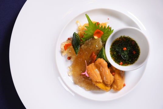 チャイニーズキュイジーヌ”La voute” 涼拌海丹排翅 噴火湾産“キタムラサキ雲丹”と鱶鰭、クラゲの冷菜6,655円