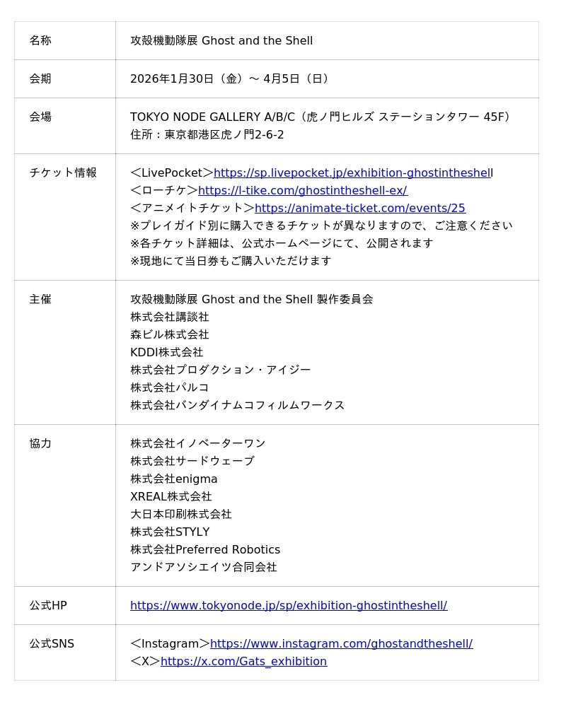 攻殻機動隊展 Ghost and the Shell 製作委員会(株式会社講談社、森ビル株式会社、KDDI株式会社、株式会社プロダクション・アイジー、株式会社パルコ、株式会社バンダイナムコフィルムワークス)は、2026年1月30日(金)から4月5日(日)まで、虎ノ門ヒルズの情報発信拠点「TOKYO NODE(東京ノード)」にて開催する『攻殻機動隊展 Ghost and the Shell』の特別企画としてトークセッションシリーズの『DIALOGUE(ダイアローグ) of Ghost and the Shell』と、音楽イベントシリーズの『REFLEX(リフレクス) of Ghost and the Shell』を、会場内の展示空間GALLERY A “NODE”(思考の結節点)にて本展会期中に開催いたします。