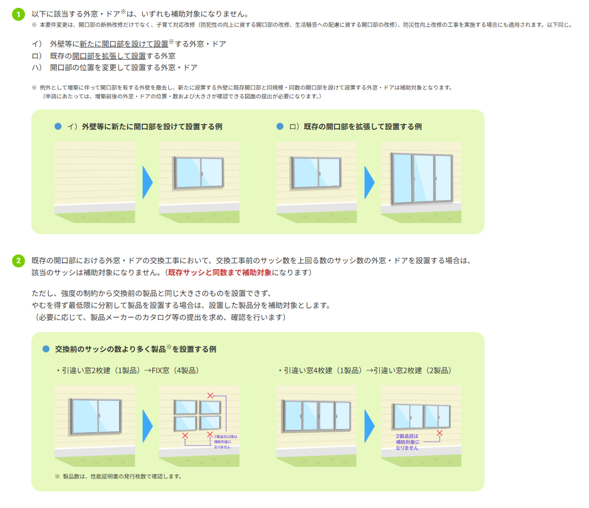 また、交換工事において元のサッシ数を上回る数の外窓・ドアを設置する場合、その超過分は対象外。ただし、BELS評価書などで性能等級5を満たすと証明できる場合には例外的に補助対象となるケースもあります。