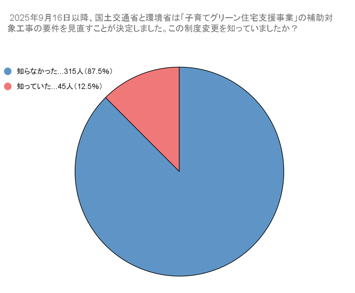 アンドリフォームが実施したアンケート(リフォーム・新築経験者または検討中の359名)では、「要件厳格化を知っていた」と答えた人はわずか45人(12.5%)にとどまりました。