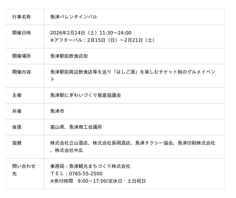魚津駅にぎわいづくり推進協議会(会長 四十万隆一/事務局 魚津観光まちづくり株式会社)は、2月14日(土)に「はしご酒」を楽しむグルメイベント「魚津バレンタインバル」を初開催します。5枚つづりのバルチケットを使って最大5軒の食べ飲み歩きが楽しめるイベントです。チケット1枚につき対象店舗で1ドリンクと1ピンチョス(おつまみ等)が提供されます。当日は富山県東部最大級の飲食店街・柿の木割りの飲食店など約30事業者(2026年1月時点)が参加予定。女性店主の店舗も多く、女性の活躍を応援する機会にもつなげます。