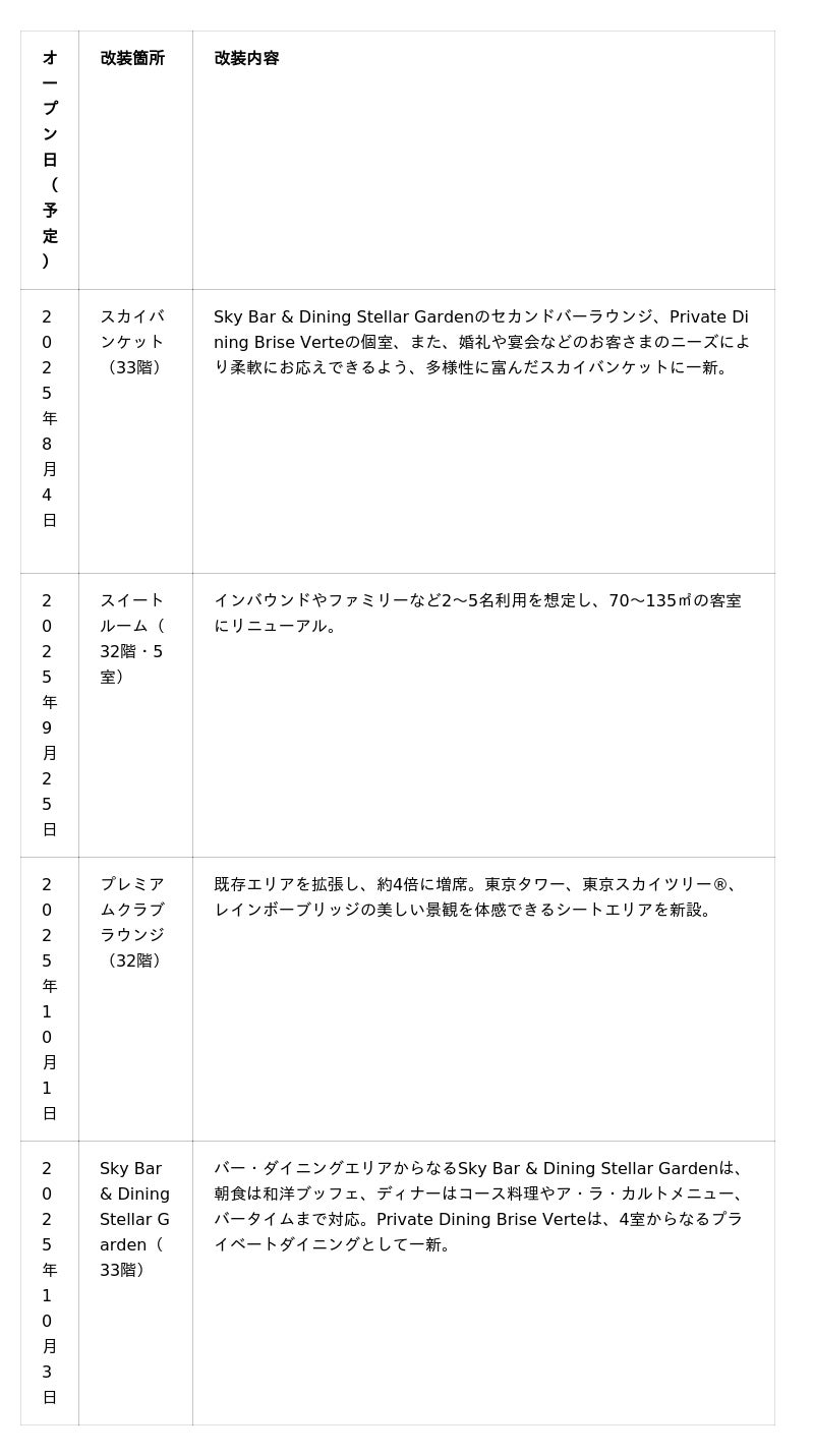 2005年4月の開業以来、ホテルのメインダイニングとして多くのお客さまにご愛顧いただきました「レストラン ブリーズヴェール」、また、“THE東京”の絶景をお楽しみいただけるバー「スカイラウンジ ステラガーデン」は、2025年5月下旬よりホテルの価値向上のため改装し、3つのエリアからなる「Sky Bar & Dining Stellar Garden」として一新いたします。