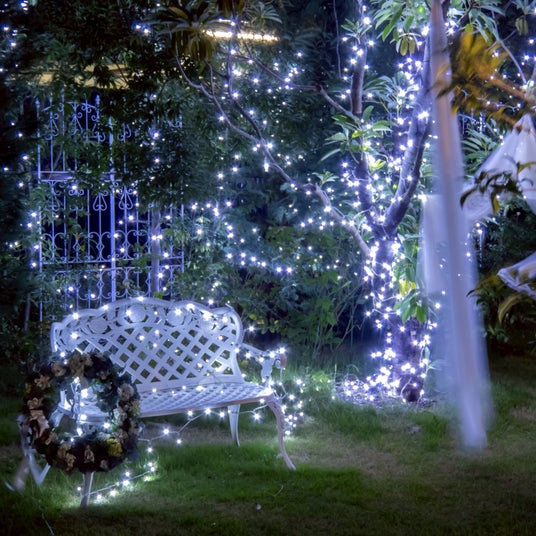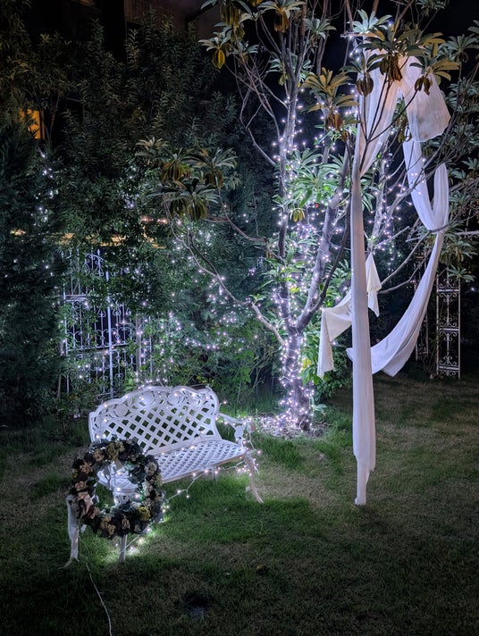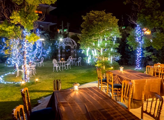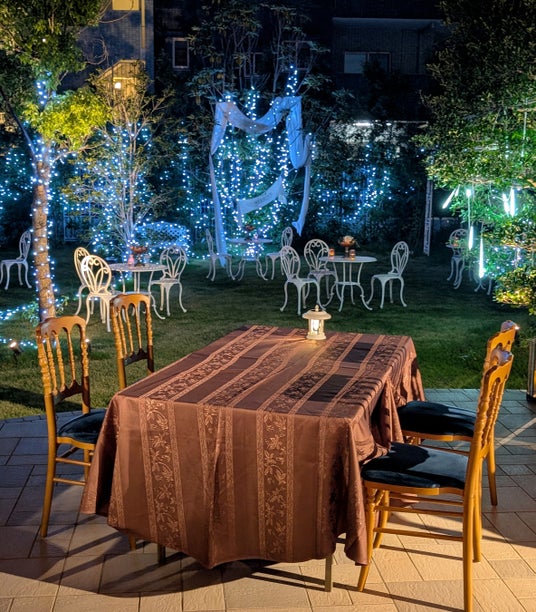星降る庭には5卓のガーデン席。イルミネーションを眺め夜風に当たりながらグラスを傾けるひととき。