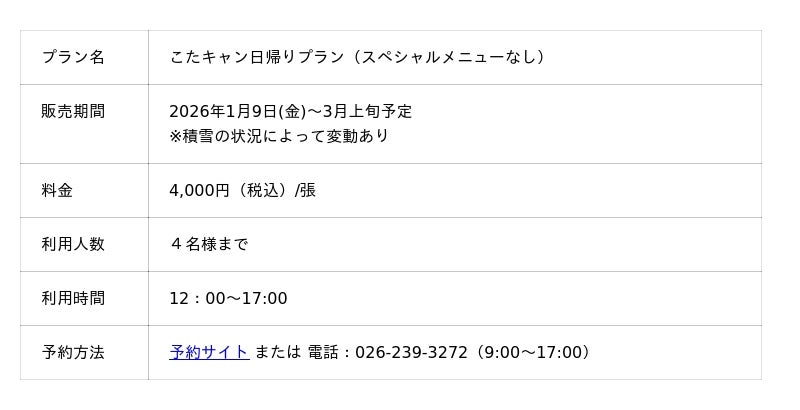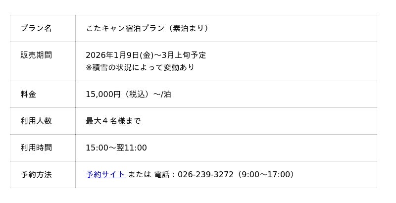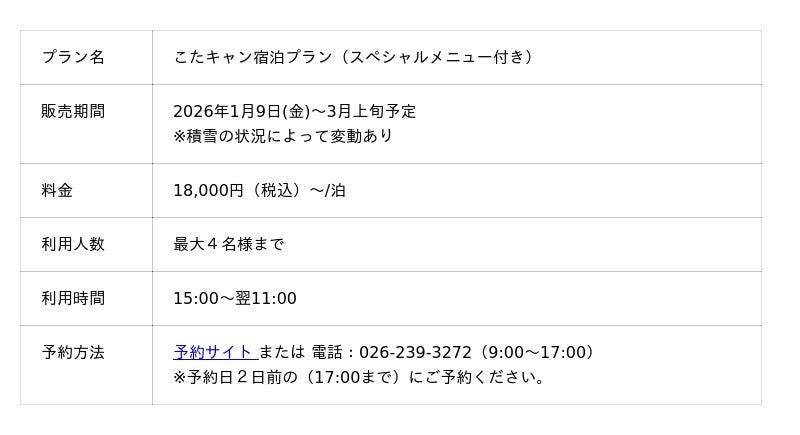 nagano forest village (所在地:長野県長野市、運営:eternal story株式会社 )は、2026年1月9日(金)から3月上旬まで冬ならではの体験プラン「こたキャン」を販売いたします。