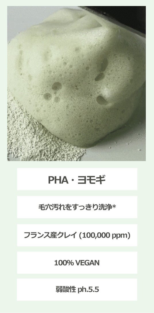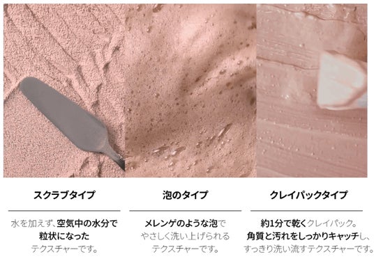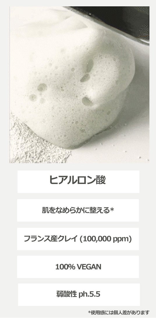 ■ 特徴: フランス産クレイと酵素を組み合わせた洗顔料。古い角質や毛穴の汚れをオフするように設計されており、洗顔後もつっぱりにくい心地よさを追求しました。また、水の量を調整することで肌の状態や気分に合わせた3つの使い分けができます。