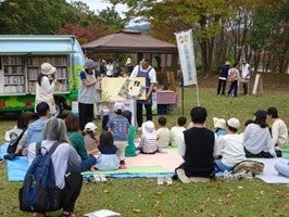 自然の中で、移動図書館が運んでくるたくさんの本に触れながら親子で心地よい時間を過ごします。