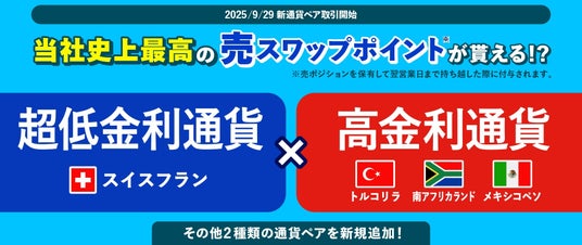 トレイダーズホールディングス株式会社(東京証券取引所スタンダード市場8704)のグループ会社で、外国為替証拠金取引事業(FX取引)等を営むトレイダーズ証券株式会社(本社:東京都渋谷区、代表取締役:須山 剛、以下「トレイダーズ証券」)は、2025年9月29日(月)より外国為替取引サービス「みんなのFX」及び「LIGHT FX」において、低金利国(スイス)と高金利国(トルコ・南アフリカ・メキシコ)の通貨を組み合わせた新通貨ペアの取扱を開始することを決定しました。