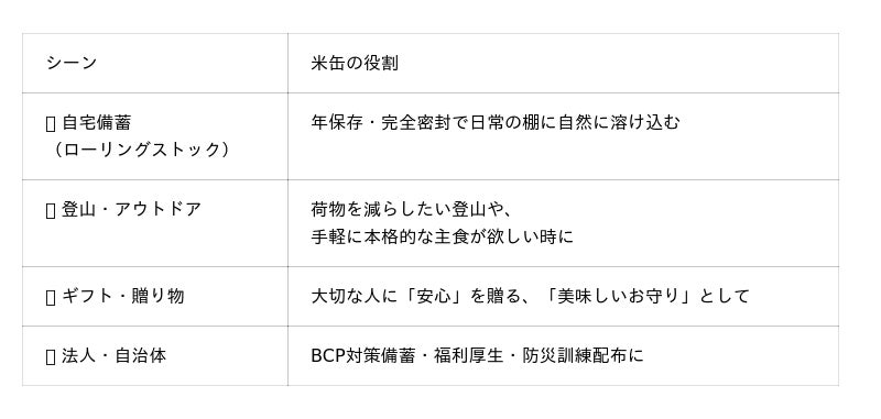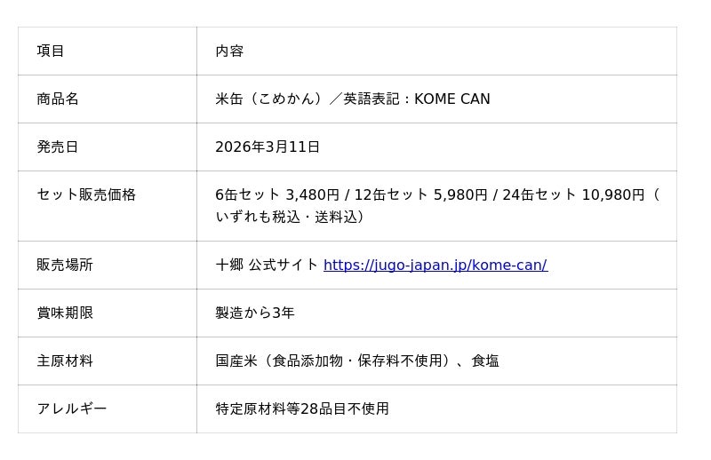一般社団法人 十郷(所在地:新潟県岩船郡関川村、代表:中井 達朗)は、火も水も電気も使わず、フタを開けた瞬間にふっくらしたお米が食べられる完全密封の備蓄食「米缶(こめかん)」の開発に成功しました。2026年3月11日(水)より、公式オンラインストアにて、予約販売を開始いたします。