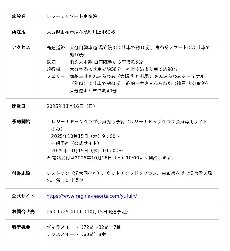 東京建物株式会社(本社:東京都中央区、代表取締役 社長執行役員 小澤 克人、以下「東京建物」)のグループ会社である東京建物リゾート株式会社(本社:東京都中央区、代表取締役 社長執行役員 加藤 久利、以下「東京建物リゾート」)は、愛犬同伴型ラグジュアリーリゾートホテル「レジーナリゾート」シリーズとして九州初となる「レジーナリゾート由布院」の開業日が2025年11月16日(日)に決定しましたのでお知らせします。また、開業に先立ち10月15日(水)より宿泊予約受付を開始します。