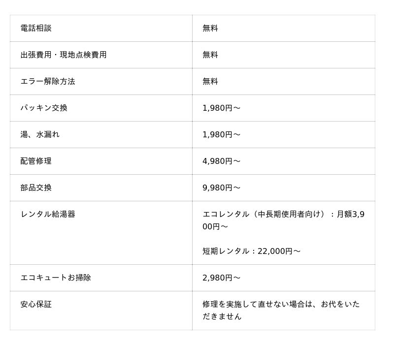 また、修理が完了しなかった場合は費用をいただかない安心保証を設けているほか、エコキュートの点検やお掃除など、日常的なメンテナンスの相談にも幅広く対応。