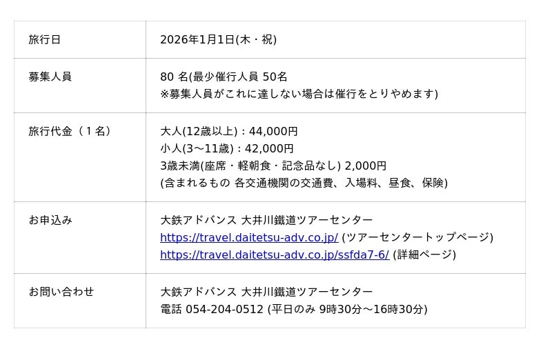 大井川鐵道(株)グループ会社の(株)大鉄アドバンス、(株)フジドリームエアラインズ、富士山静岡空港(株)の三社連携による、新春を彩る特別なツアー「富士山遊覧フライトツアー」をご案内いたします。