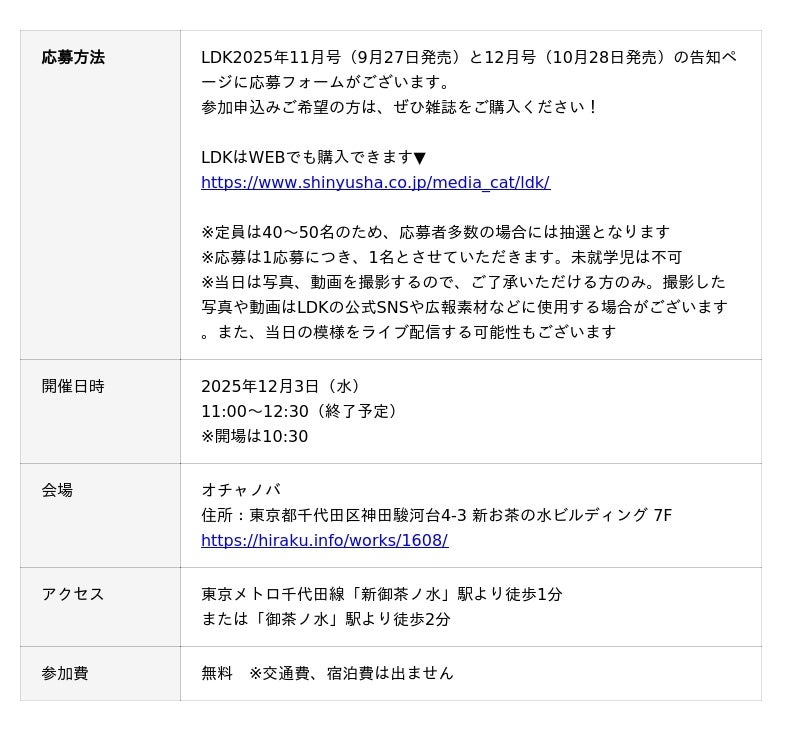 株式会社晋遊舎(本社:東京都千代田区)が発行するテストする女性誌『LDK』は、2025年12月3日(水)に「LDK FAN MEETING 2025」を開催いたします。いつもLDKを読んでくださっている読者のみなさまに感謝の気持ちを込めて、抽選で40~50名様をご招待!ファンミーティングは創刊12年にして初開催となります。