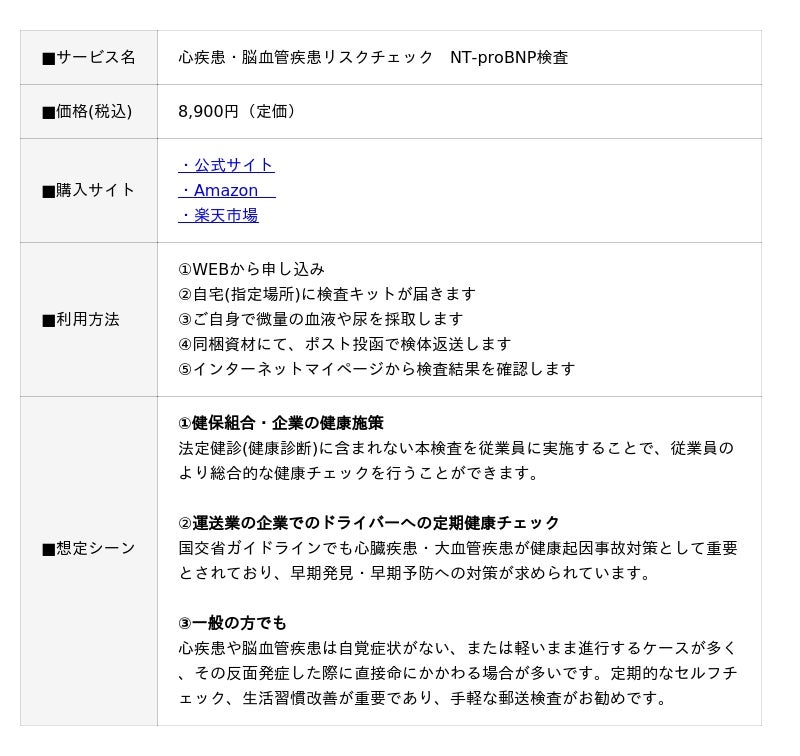 性感染症,生活習慣病などの郵送検査サービスを提供する(株)GMEでは、心疾患・脳血管疾患リスク検査としてNT-proBNP検査を実施しています。