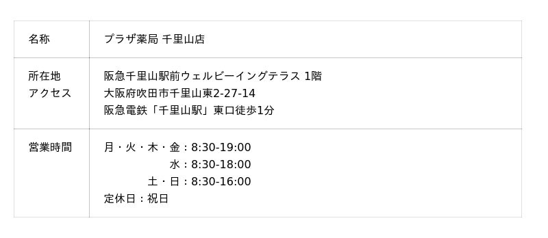 株式会社プラザ薬局(本社:大阪府八尾市、代表取締役:小田典央)は、2025年12月1日(月)に大阪府吹田市の阪急電鉄千里山駅前に調剤薬局「プラザ薬局千里山店」をオープンします。
