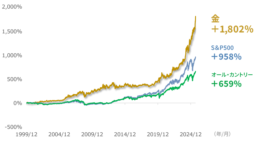 金:LBMA金価格、S&P500:S&P500指数(配当込み)、オール・カントリー:MSCIオール・カントリー・ワールド指数(配当込み) 期間:1999年12月31日~2025年9月30日 出所:ブルームバーグ 近年、国際金市場では過去最高の取引価格を記録していますが、過去最高の金取引価格が維持される保証はなく、金の価値が大幅に減少する可能性があります。指数には直接投資することはできず、取引コストや流動性等の市場要因なども考慮されておりませんので、実際の取引結果とは異なります。上記は過去のデータであり、将来の結果を示唆あるいは保証するものではありません。