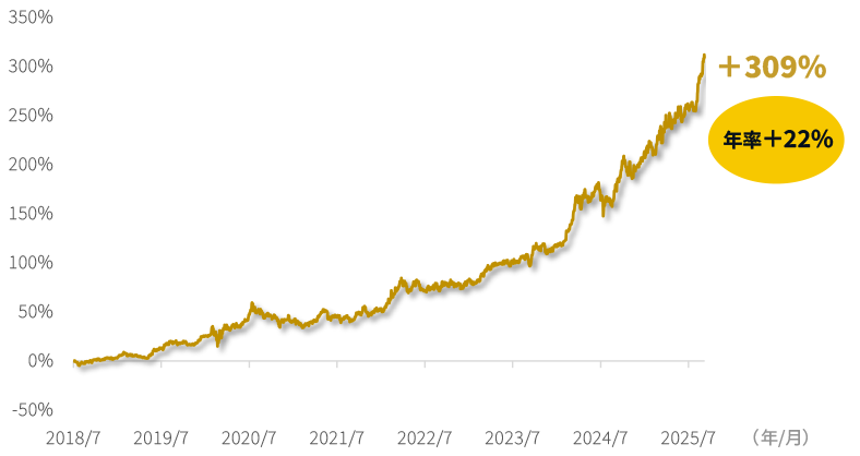 期間:2018年7月26日(設定日)~2025年9月30日、出所:ゴールドマン・サックス・アセット・マネジメント ETFの1口当たり純資産価格(NAV)ベースであり、運営費用(年率0.18%)は控除されています。米ドル・ベースの純資産価格をゴールドマン・サックス・アセット・マネジメントが円換算して表示しています。上記は運用戦略をご理解いただくためのご参考として表示したものであり、ゴールドマン・サックス・フィジカル・ゴールド・ETFの取得の勧誘を意図するものではありません。上記は本ファンドの実績ではありません。過去の運用実績は将来の運用成果を示唆あるいは保証するものではありません。