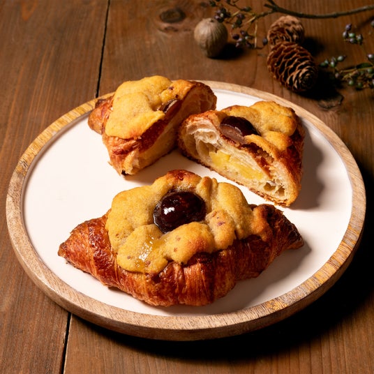 粒入りの栗餡をサンドしたクロワッサンに、渋皮栗のアーモンドクリームを絞ってサクッと焼き上げました。