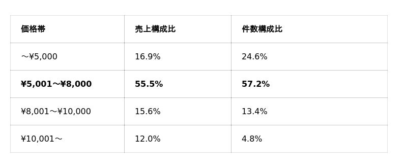 延べ117,033人の購買行動データを価格帯別に分析したところ、¥5,000~8,000の価格帯が売上全体の55.5%、注文件数の57.2%を占めることがわかりました。