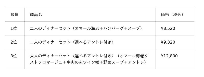 ディナーセット売れ筋ランキング TOP3