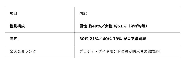 2026年2月時点の顧客分析レポート(楽天市場R-Karte)によると、当店の購入者プロファイルには以下の特徴が見られます。
