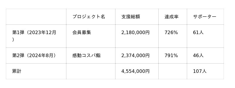 同店がMakuakeでプロジェクトを実施するのは今回で3度目。第1弾(2023年12月)では目標の726%となる218万円、第2弾(2024年8月)では791%となる237万円を達成し、累計で455万円・107名のサポーターから支援を集めてきました。