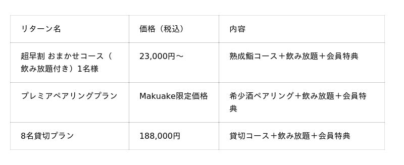 今回のプロジェクトは、2026年5月10日に予定している店名変更(「鮨楽座 八の樹」→「麻布十番 鮨やのき」)およびリニューアルオープンを記念して実施するもので、超早割価格23,000円~の熟成鮨おまかせコース(飲み放題付き)や、希少酒プレミアペアリングプラン、8名貸切プラン(188,000円)など、新店舗をいち早く体験できる特別リターンを用意しています。