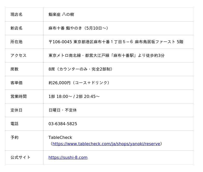 「鮨楽座 八の樹」は2023年5月のオープン以来、麻布十番の寿司激戦区で着実に支持を広げてきました。開業3年を迎える2026年5月10日、心機一転を期して「麻布十番 鮨やのき」へ店名を変更し、カウンターの張り替えと壁面の塗り直しによる内装リニューアルを実施します。