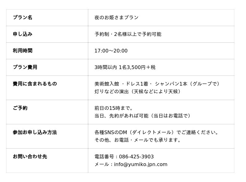 Princess Park Kurashikiでは、その夜の時間を 女性も安心して楽しめる新しい滞在体験 として、予約制の 「夜のお姫さまプラン」 を開始します。