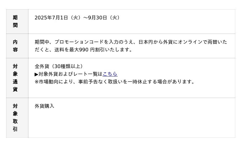 ※オンラインでの外貨購入のみ有効です。店舗取引やトラベレックスマネーカードへのチャージにはご利用いただけません。