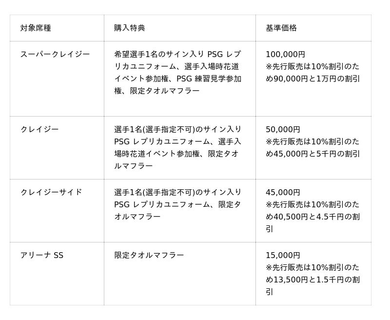 以下の3席種、各試合80席の方にパリ・サン=ジェルマン選手の直筆サイン入りレプリカユニフォームが座席購入特典として付いてきます。希望選手のサインを特典としてプレゼントすることはツアー初の試みとなり、これまでの観戦いただいたファンの方からの声にお応えする形で実現することになりました。