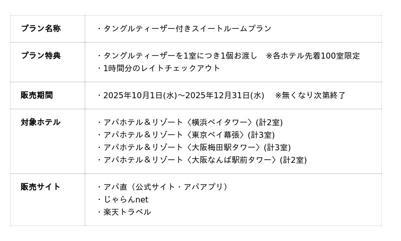 アパホテルネットワークとして全国最大の1,015ホテル139,741室(建築・設計中・海外、アパ直参画ホテルを含む)を展開するアパホテル株式会社(本社:東京都港区赤坂3-2-3社長 元谷芙美子)は、株式会社プリアップ(本社:神奈川県横浜市港北区新横浜2-11-5 川浅ビル 代表取締役:明永 敏悟)と、アパホテル&リゾートのスイートルームとコラボレーションした『タングルティーザー付きスイートルームプラン』を、2025年10月1日(水)より販売します。