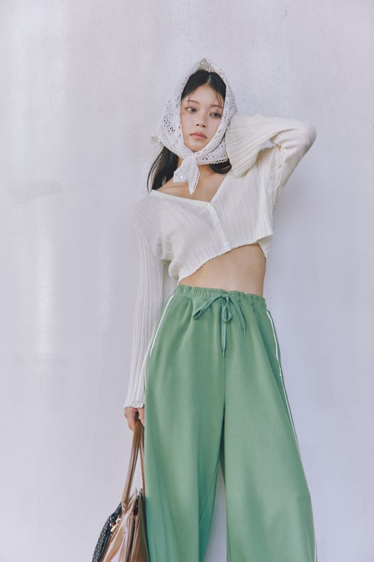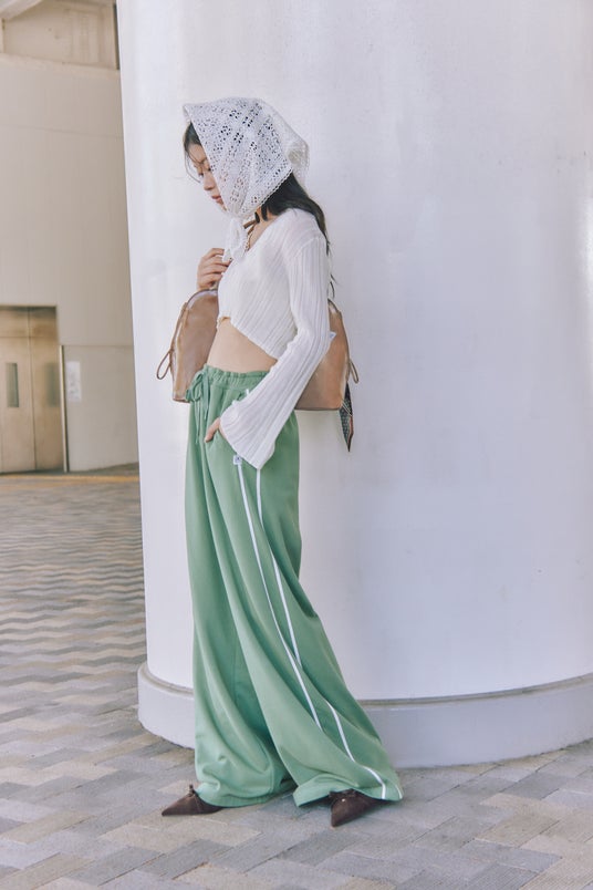 今回のコレクションで発売される、同素材のワイドパンツと合わせた、統一感のある着こなしもおすすめです。